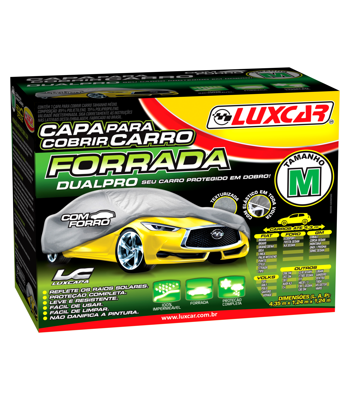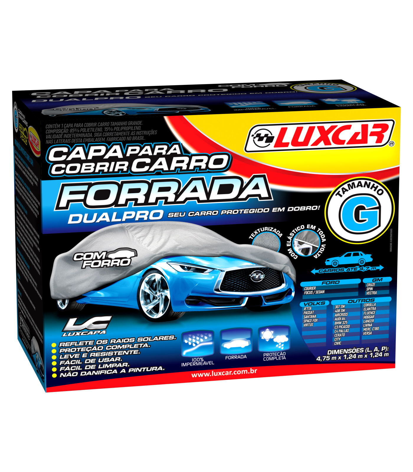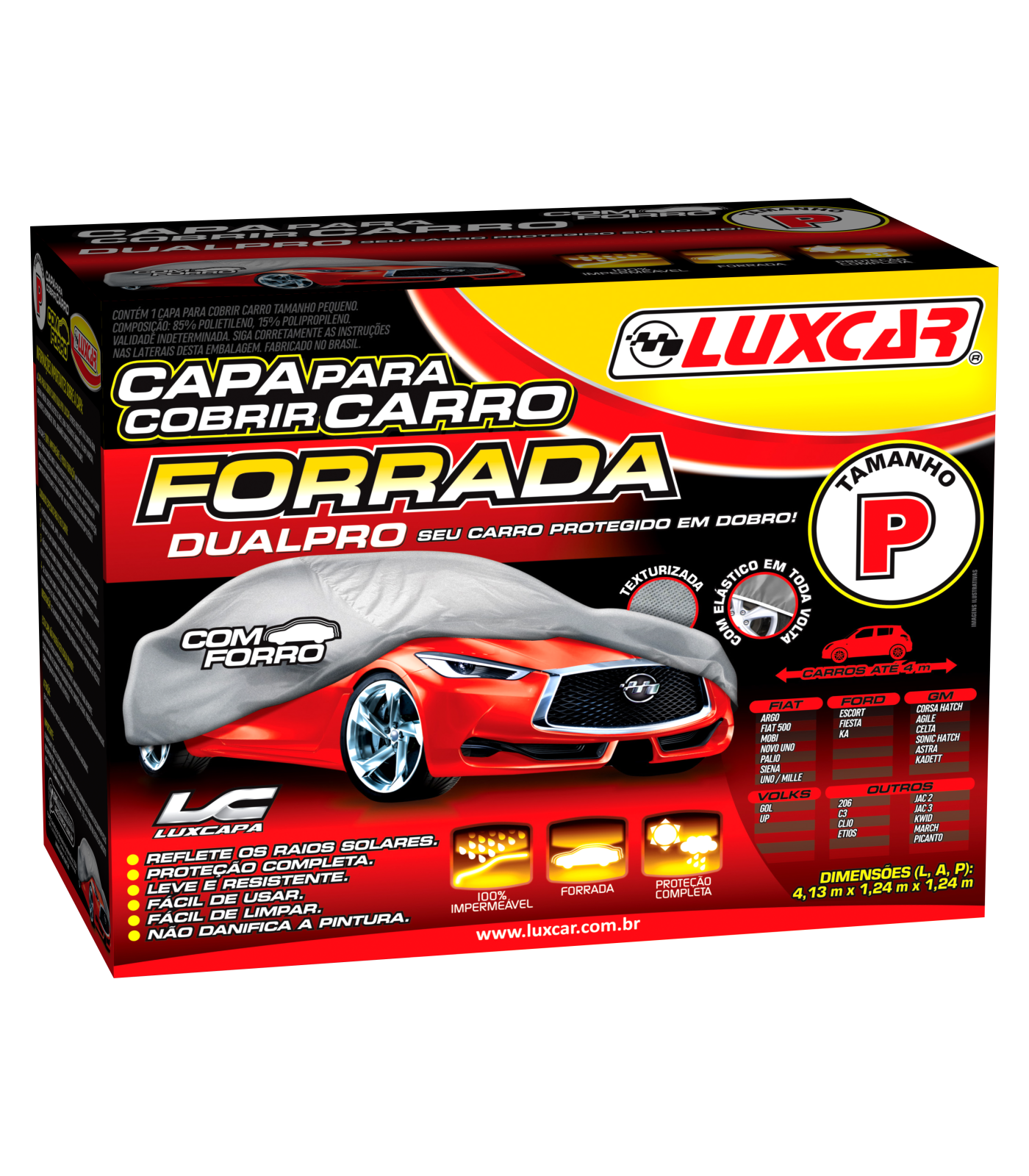 A Capa para Cobrir Carro DualPro Luxcar oferece proteção total contra água, sujeira, poeira, sereno, dejetos de aves, seiva e resíduos de árvores, fuligem, maresia, poluentes, respingos de tinta, arranhões superficiais e raios solares. Esta capa é 100% impermeável e possui forração nos pontos de contato com o carro, ideal para situações onde o carro necessite ficar exposto ao clima. Confeccionada em polietileno de alta qualidade e resistência com camada refletiva para melhor proteção contra os raios solares e forro em TNT de alta qualidade.