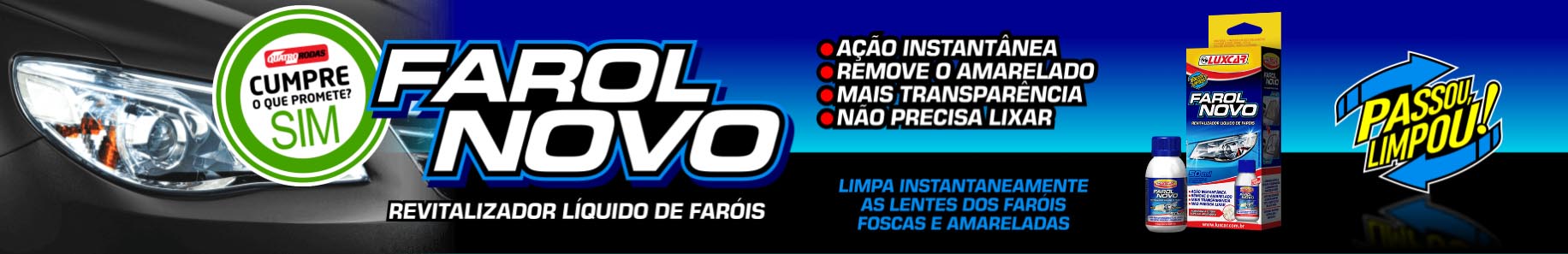 Com o Revitalizador Líquido Farol Novo Luxcar os faróis do seu carro ficam novos em minutos, sem a necessidade de trocá-los, lixá-los ou polir.